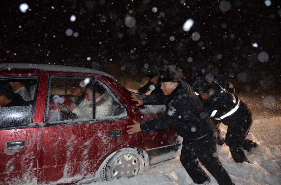 Chinese policemen fight a storm. (Photo/Xinhua)