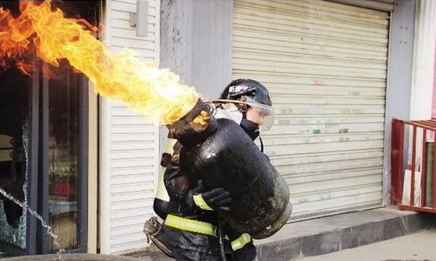 A Chinese firefighter carries a burning LNG storage tank. (Photo/Xinhua)