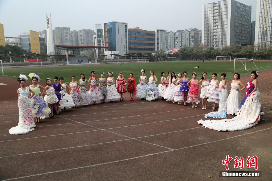 College students in Chengdu Polytechnic show their self-designed wedding dresses made from waster paper on the campus playground, Jan. 12, 2015. (CNS/Zhang Lang)