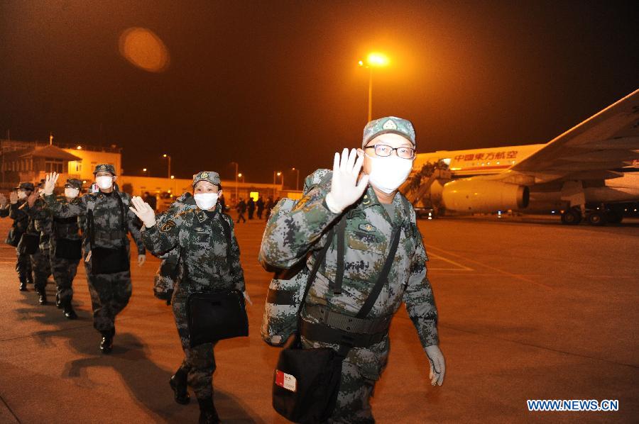 Members of the Chinese medical team assisting in the prevention and control of the Ebola virus in Liberia wave as returning to Chongqing, southwest China, Jan. 16, 2015. A total of 82 medical workers, as the first batch of the 164-member team, returned to motherland on Friday morning. The rest of the group will return on Jan. 22. (Xinhua/Tang Yi)