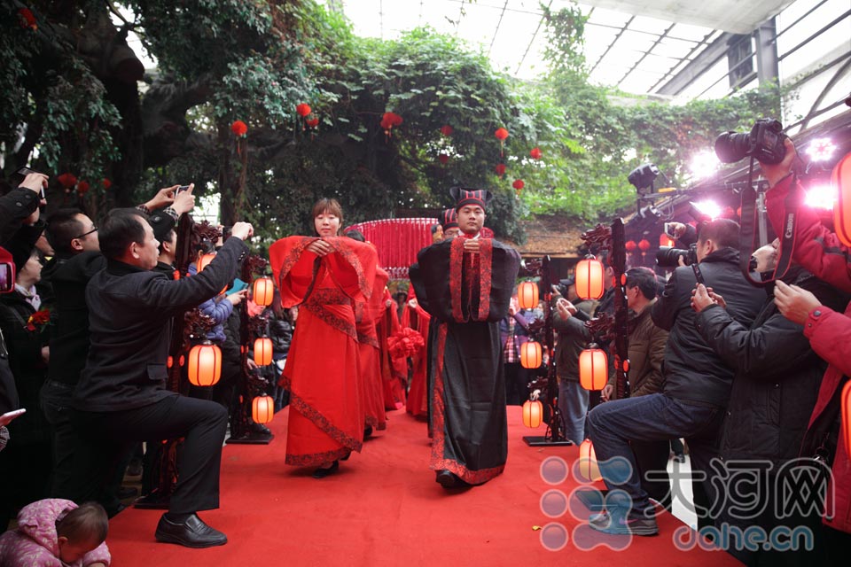 A couple holds a traditional wedding ceremony wearing Hanfu (Han costume) in Heluo Town, Gongyi, central China's Henan Province, Jan. 14, 2015. The wedding ceremony was conducted in accordance with traditional wedding customs of the Zhou Dynasty, and all the wedding attendees wore Hanfu clothes. (dahe.cn/Fan Zhao)