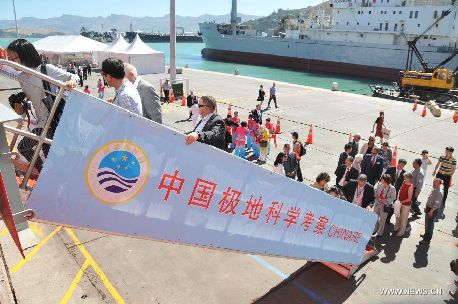 Guests and local residents visit the Chinese icebreaker Xue long in Christchurch, New Zealand, Jan. 17, 2015. Chinese icebreaker and polar research vessel Xue Long arrived at Lyttelton Port in Christchurch on Friday. The Christchurch City Council and Antarctica New Zealand welcomed the vessel in Maori style. (Xinhua/Su Liang)