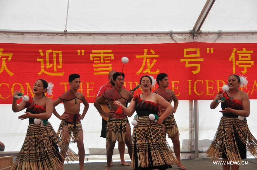 Local people welcomes the Chinese icebreaker Xue Long with Maori dance in Christchurch, New Zealand, Jan. 17, 2015. Chinese icebreaker and polar research vessel Xue Long arrived at Lyttelton Port in Christchurch on Friday. The Christchurch City Council and Antarctica New Zealand welcomed the vessel in Maori style. (Xinhua/Su Liang)