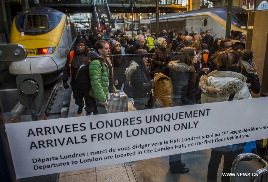 Passengers get off a Eurostar train that reversed from the Channel Tunnel due to a fire alarm at the Gare du Nord train station in Paris, France, Jan. 17, 2015. All services of Eurostar were suspended Saturday due to smoke detection in the Channel Tunnel, Eurostar announced Saturday. All trains were returning to original stations as the Channel Tunnel linking Britain and France was closed until further notice, Eurostar's customer care team said on its Twitter account. (Xinhua/Chen Xiaowei)