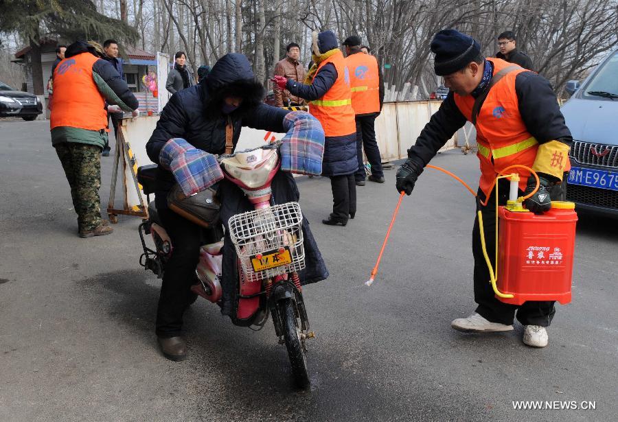 A staff member disinfects a rider's electric bike at the entrance to the Sanmenxia Reservoir Area of the Yellow River, central China's Henan Province, Jan. 17, 2015. A total of 93 wild birds including swans and wild ducks had died in the area as of Jan. 14. According to the National Bird Flu Reference Laboratory, the H5N1 virus, a highly contagious strain of bird flu, has caused deaths in the Sanmenxia Reservoir Area, which is a winter habitat for swans that migrate from Siberia in Russia. Local government in Sanmenxia have taken a variety of measures to prevent a possible spread of the virus, including blocking the entrance and examining people who had close contact with the birds. No human infection has been reported so far. (Xinhua/Zhu Xiang)