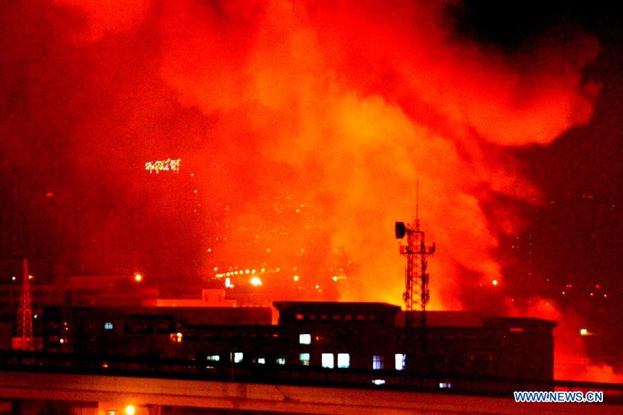 | Photo taken on Jan. 17, 2015 shows a burning liquefied gas station which exploded after a tank truck caught fire in the Jinzhou District in Dalian, northeast China's Liaoning Province. The explosion caused 4 injures who were sent to hospital for treatments. (Xinhua) |