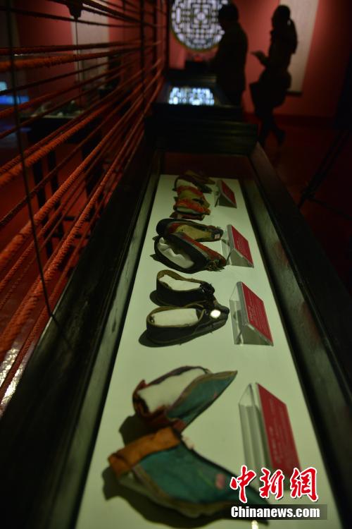 Once destroyed by a fire, the "Three Inch Lotus" Museum reopens in Chengdu, southwest China's Sichuan province on Jan. 15, 2015. With over 5,000 pairs of "lotus shoes" on display, the museum reveals the thousand-year history of the foot-binding custom of Chinese women. "Three inch lotus" was a term used to call the bound feet of women or the exceptionally small shoes they wear. The smallest shoes on display are only 9 centimeters long. (Chinanews/Zhang Lang)
