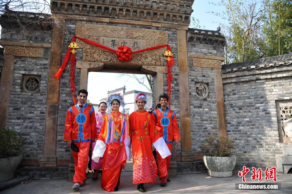Over 100 college students from 26 countries gathered at the folk culture museum of Anhui Province to experience the traditional Chinese wedding of Qing dynasty on Jan. 18, 2015.