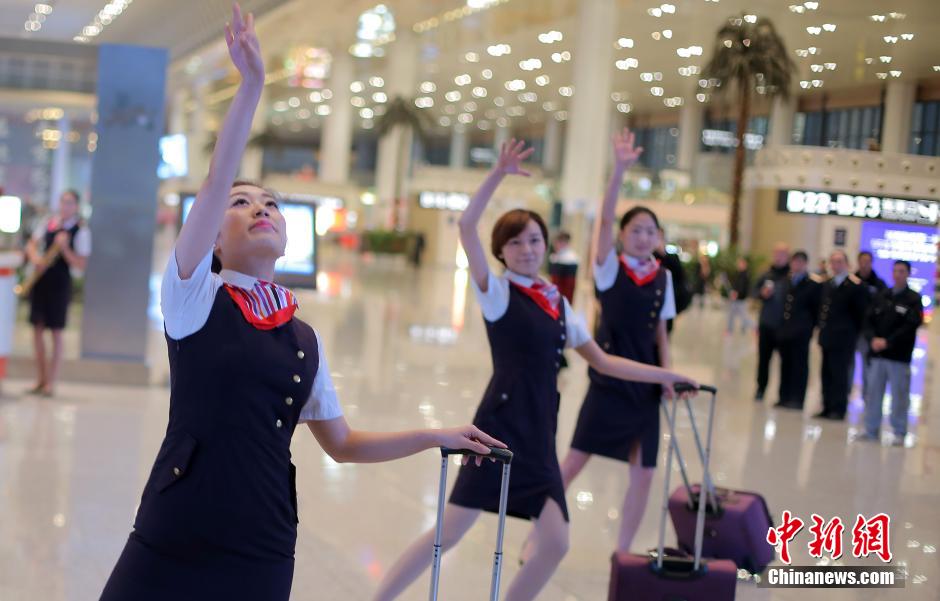 A flash mob, consisting of staff members in uniforms, welcomes passengers at Nanjing South Railway station , east China's Jiangsu province on Jan. 15, 2015. (CNS/Yang Bo)
