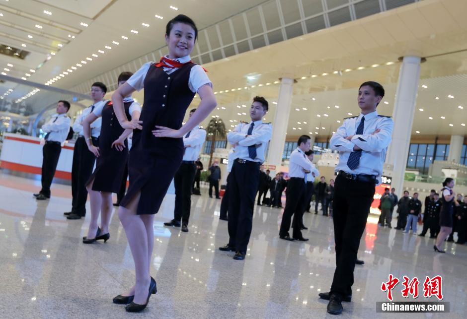 A flash mob, consisting of staff members in uniforms, welcomes passengers at Nanjing South Railway station , east China's Jiangsu province on Jan. 15, 2015. (CNS/Yang Bo)