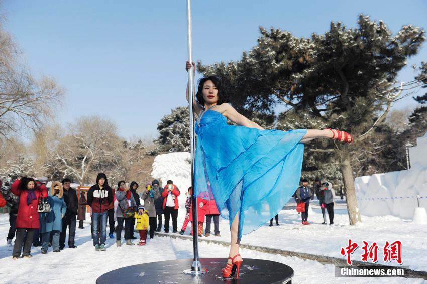 A pole dancer shows her moves in snow in Changchun, capital of northeast China's Jilin province, Jan. 19, 2015. The temperature that day was minus 20 degrees Celsius. It is said that the dancer wanted to show the charm of pole dancing through her moves, and to break people's prejudices against the dance. (CNS/Zhang Yao)