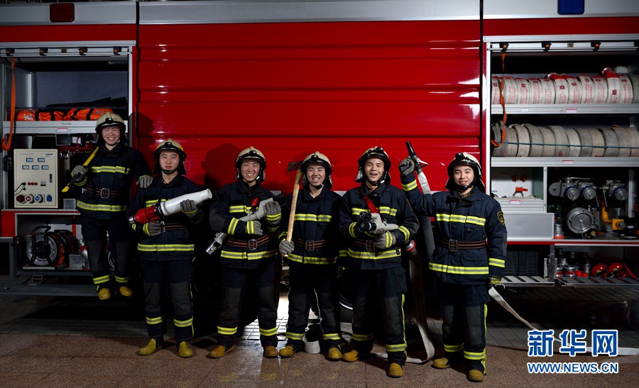 Post-90s generation firefighters pose for a photo in the front of a fire-engine on Jan. 9, 2015. (Xinhua/ Wang Shen)
