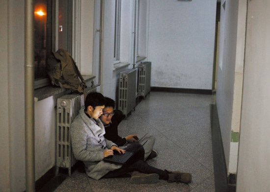 12:45 a.m., Dec.8, 2014 - To not disturb other people, Huang and Cui discuss their plan for a documentary film for a contest in the hallway.