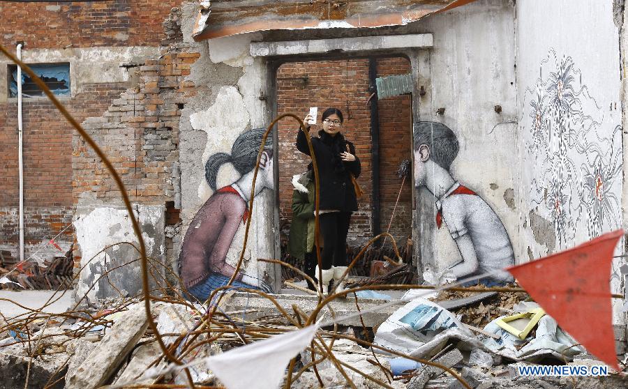 A woman takes photos of graffiti paingtings on a demolished wall in Shanghai, east China, Jan. 22, 2015. Graffiti paintings were found recently on debris at a residential lane, where old houses were demolished. (Xinhua/Fang Zhe)