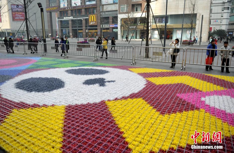 A huge beautiful "carpet", made from 19 tons of candies in different colors, is seen in Chengdu on Jan. 21, 2015. (Chinanews/Liu Zhongjun)
