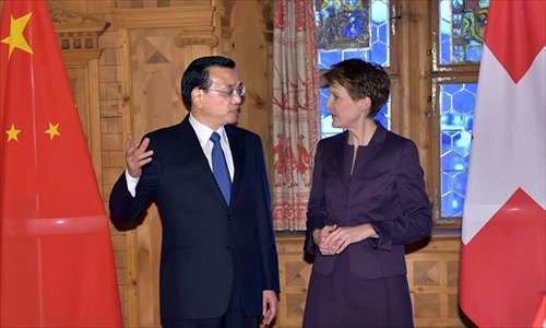 Chinese Premier Li Keqiang talks with President Simonetta Sommaruga of the Swiss Confederation on the sidelines of the 2015 annual meeting of the World Economic Forum in Davos on Wednesday. Photo: Xinhua