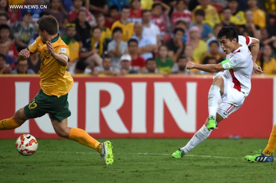 China's Zheng Zhi (R) shoots during the quarterfinal match against Australia at the 2015 AFC Asian Cup in Brisbane, Australia, Jan. 22, 2015. China lost the match 0-2. (Xinhua/Guo Yong)