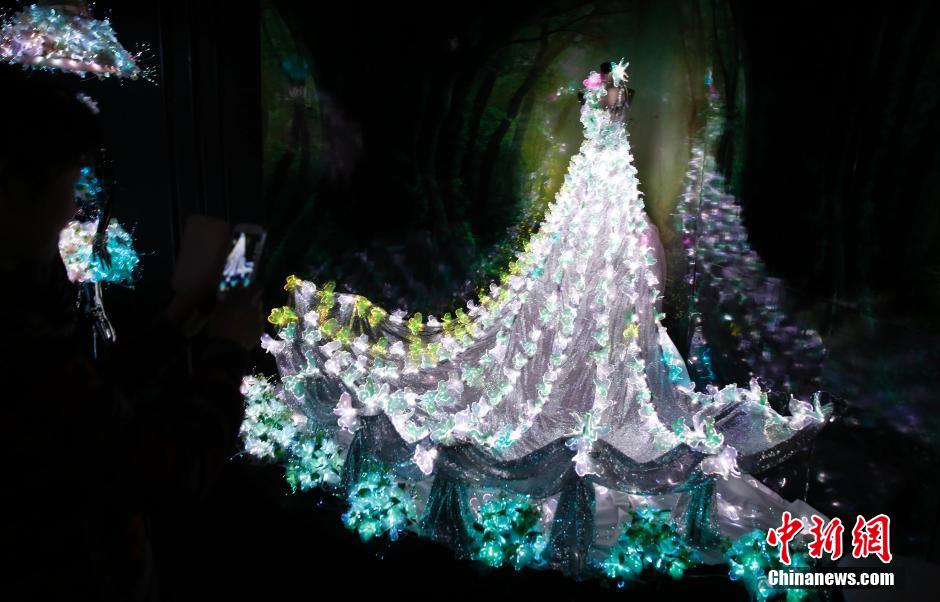 An eye-catching fiber-optic wedding dress show was held at the 27th China Wedding Expo in Shanghai, Jan. 20, 2015. The wedding dresses presented are made of optical cable, fiber-optical cloth and LED lights, which can shine colorfully when the lights are turned on with wireless remote controllers.