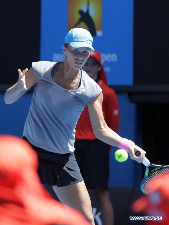 Varvara Lepchenko of the United States returns the ball against Agnieszka Radwanska of Poland during the third round of the women's singles on Day 6 of the 2015 Australian Open tennis tournament in Melbourne on Jan. 24, 2015. Varvara Lepchenko lost 0-6 5-7. (Xinhua/Jin Linpeng)