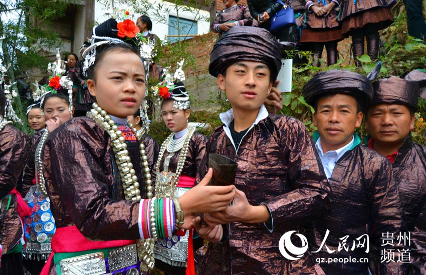 Villagers welcome guests with ox-horn wine in Congjiang county, southwest China's Guizhou province. (gz.people.cn/He Huiyu)