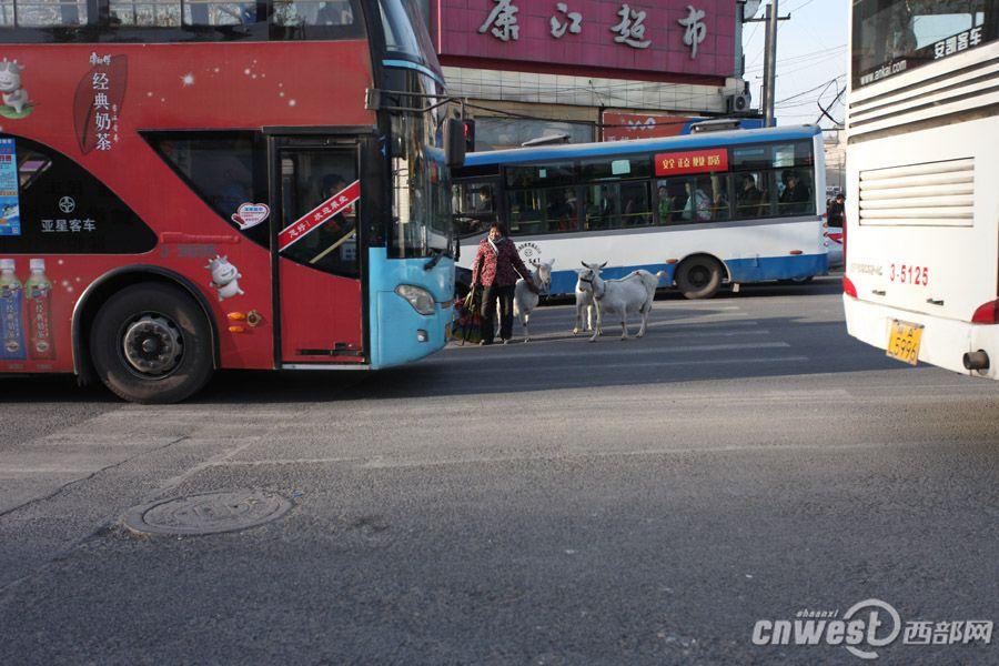 Liang and her sheep wait for the green light to cross the street. (Photo/cnwest.com)