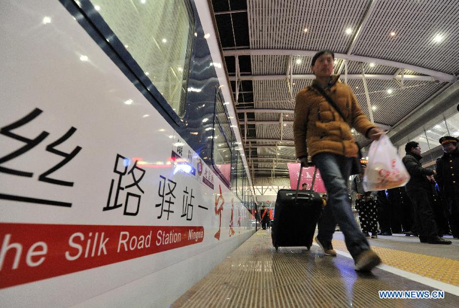 | Passengers parpare to board "The Silk Road Station-Ningxia" train in Yinchuan, capital of northwest China's Ningxia Hui Autonomous Region, Jan. 26, 2015. The train, which started its debut journey from Yinchuan to Beijing, capital of China, on Jan. 26, is featured with its strong local flavor and high-end quality. (Xinhua/Peng Zhaozhi) |