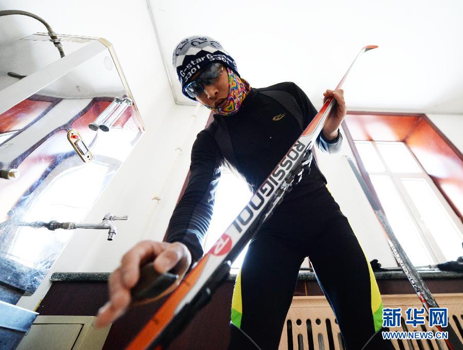 Athlete Wang Xiaoming polishes his skiing boards with wax on Jan. 22, 2015. (Xinhuanet/Wang Kai)