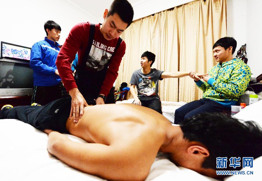 Coach Zhan Yuchao massages an athlete's injured waist. (Xinhuanet/Wang Kai)
