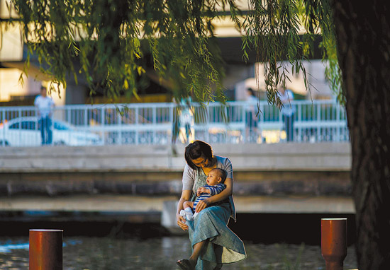 A mother and her six-month-old daughter enjoy the cool breeze by the river in a summer evening.