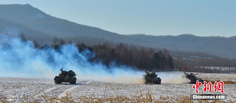| In the severe cold of minus 34 degrees Celsius, a brigade of the 16th Group Army conducts field training in northeast China on Jan. 27, 2015, so as to improve the combat ability of soldiers in severe weather. (Chinanews/Yang Zaixin) |