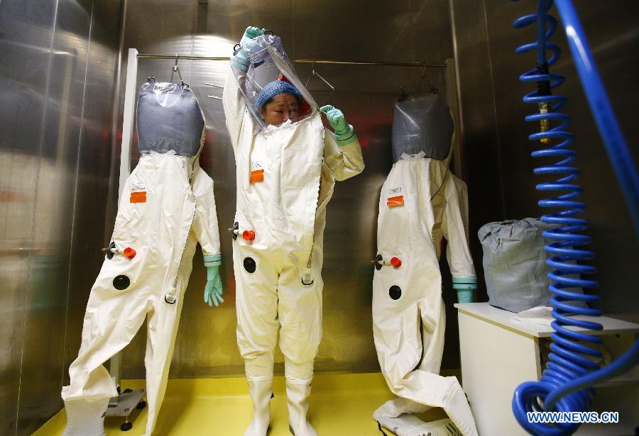 A researcher puts on a protective suit before entering the newly-completed lab in Wuhan, capital of central China's Hubei Province, Jan. 30, 2015. China completed its first high level biosafety laboratory based in Wuhan Saturday in Wuhan after more than a decade of construction. The lab will be used to study class four pathogens (P4), which refers to the most virulent viruses that pose a high risk of aerosol-transmitted person-to-person infections. (Xinhua/Yin Gang)