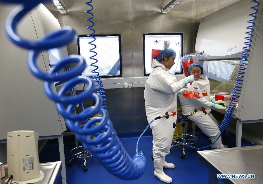 Researchers take part in a drill at the newly-completed lab in Wuhan, capital of central China's Hubei Province, Jan. 30, 2015. China completed its first high level biosafety laboratory based in Wuhan Saturday in Wuhan after more than a decade of construction. The lab will be used to study class four pathogens (P4), which refers to the most virulent viruses that pose a high risk of aerosol-transmitted person-to-person infections. (Xinhua/Yin Gang)