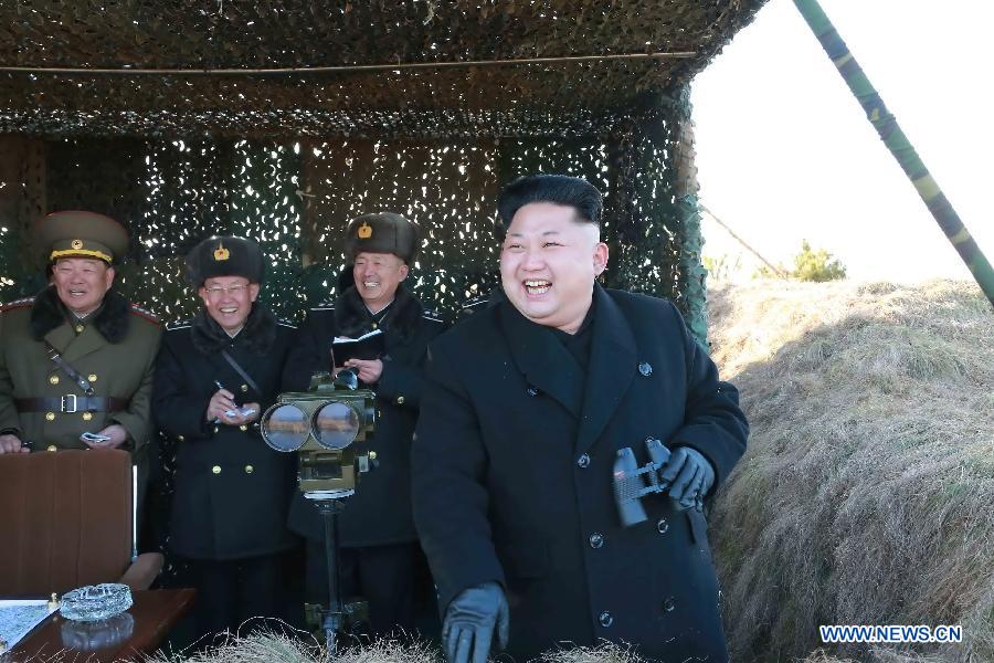 Photo provided by Korean Central News Agency (KCNA) on Jan. 31, 2015 shows top leader of the Democratic People's Republic of Korea (DPRK) Kim Jong Un (front) inspecting a drill of the Korean People's Army (KPA). The fighter airmen and combined submarine units successively carried out the drill. Kim Jong Un gave instructions for bolstering up the operation capabilities of the units of all services. He said that the DPRK is ready to counter any war including a war by conventional armed forces or a nuclear war. (Xinhua/KCNA)