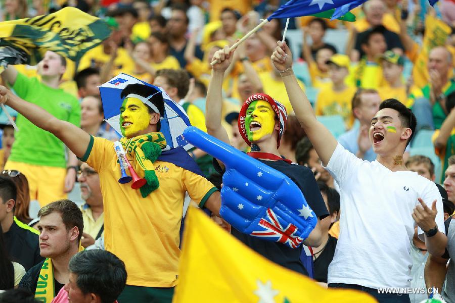 Fans of Australia cheer for the team during the final match between Australia and South Korea at the 2015 AFC Asian Cup in Sydney, Australia, Jan. 31, 2015. Australia won 2-1 and claimed the title of the event. (Xinhua/Qiu Zhongquan)
