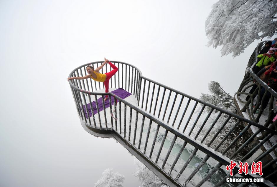 Photo taken on Jan. 31, 2015 shows a woman doing yoga in Tianmenshan scenic spot after a snowfall in Zhangjiajie City, central China's Hunan Province. (Photo source:chinanews.com)
