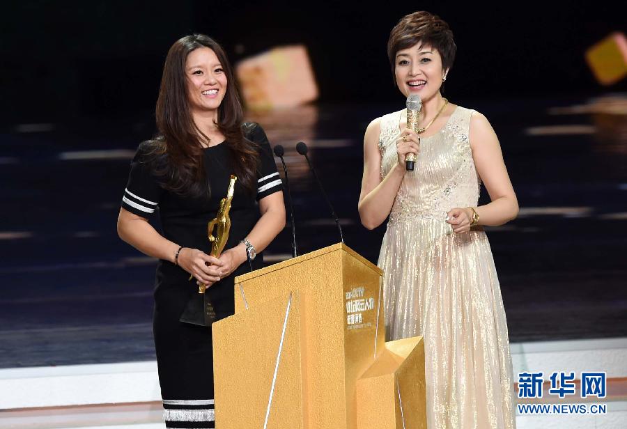 Tennis player Li Na (L) poses at the awarding ceremony of the 2014 Sports Personality of the Year after she was awarded the Best Female Athlete of the year, in Beijing, capital of China, on Feb. 1, 2015. (Source: Xinhuanet.com)