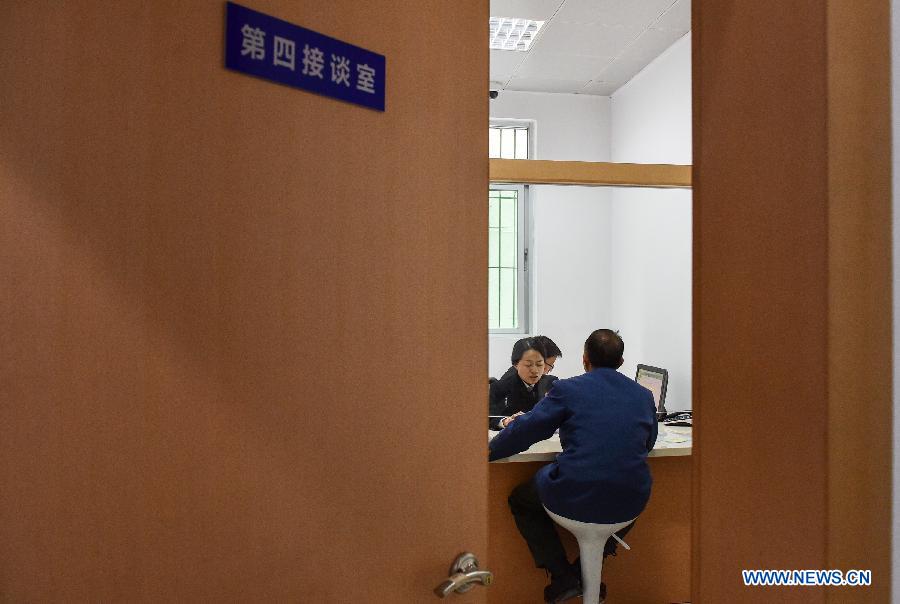 A judge of China's Supreme People's Court first circuit court receives a claimant at the reception room in Shenzhen, south China's Guangdong Province, Feb. 2, 2015. The first circuit court of China's Supreme People's Court (SPC) began to hear cases officially Monday in Shenzhen. (Xinhua/Mao Siqian)