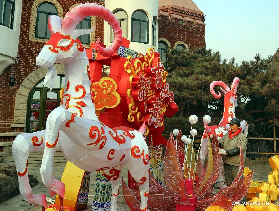 A worker fixes a lantern in a scenic spot in Beidaihe scenic area in Qinhuangdao City, north China's Hebei Province, Feb. 2, 2015. A spring festival lantern expo will be held here for 25 days starting from Feb. 10. (Xinhua/Yang Shiyao)