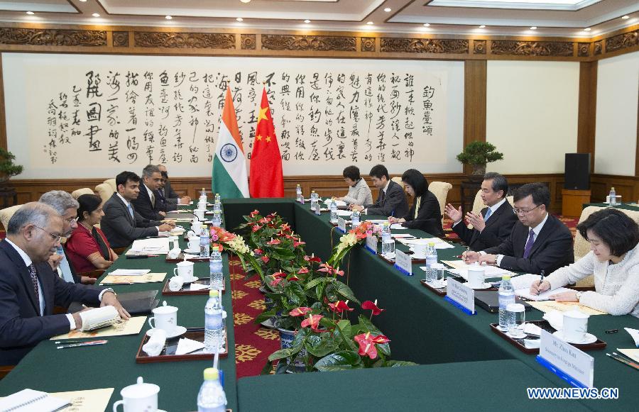 | Chinese Foreign Minister Wang Yi (3rd R) meets with his Indian counterpart Sushma Swaraj (3rd L) in Beijing, China, Feb. 1, 2015. (Xinhua/Huang Jingwen) |