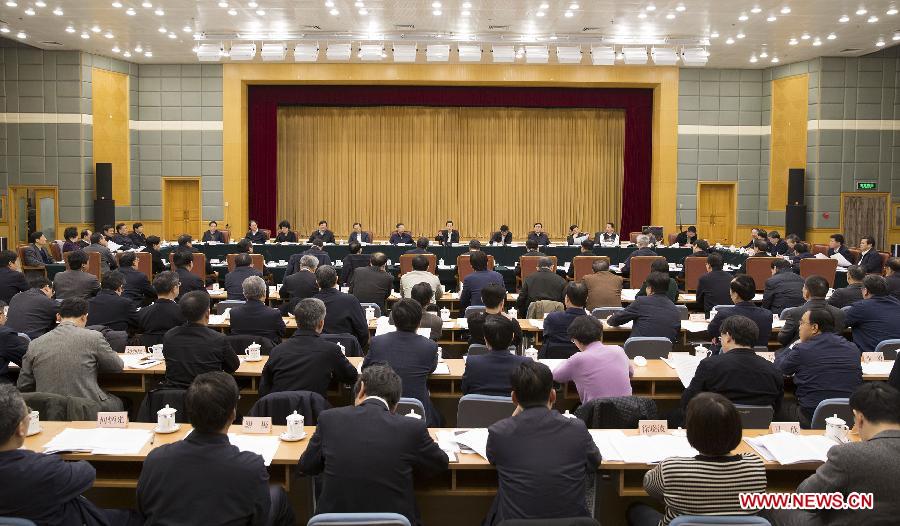 | Chinese Vice Premier Zhang Gaoli (C rear) presides over a meeting focused on the "Belt and Road" initiatives, or the building of the Silk Road Economic Belt and the 21st Century Maritime Silk Road, in Beijing, capital of China, Feb. 1, 2015. (Xinhua/Huang Jingwen) |