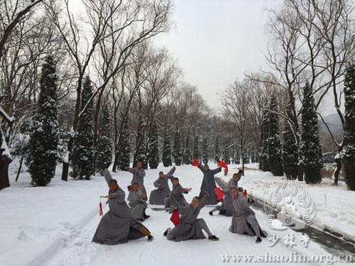 Shaolin Temple ushered in the first snow this year on Jan. 28, 2015. The snow ended early the next morning. Despite the bone-chilling cold, the monks in the temple practiced martial arts as usual in the snow. (Photo/shaolin.org.cn)
