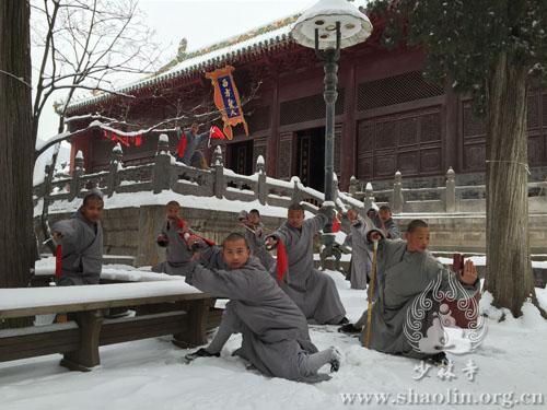 Shaolin Temple ushered in the first snow this year on Jan. 28, 2015. The snow ended early the next morning. Despite the bone-chilling cold, the monks in the temple practiced martial arts as usual in the snow. (Photo/shaolin.org.cn)
