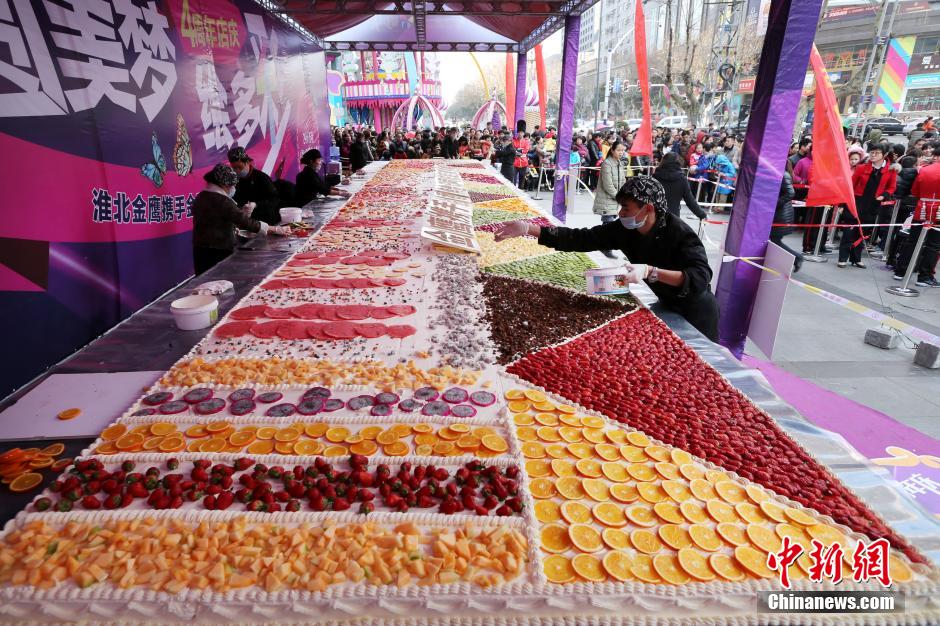 A 24-square-metre cake, made of fresh fruits including pineapple and strawberry is exhibited in Huaibei, east China's Anhui province on Jan. 18, 2015. Nine cooks spent more than eight hours to finish this cake. More than 5000 residents could taste this cake. (CNS/Wan Shanchao)