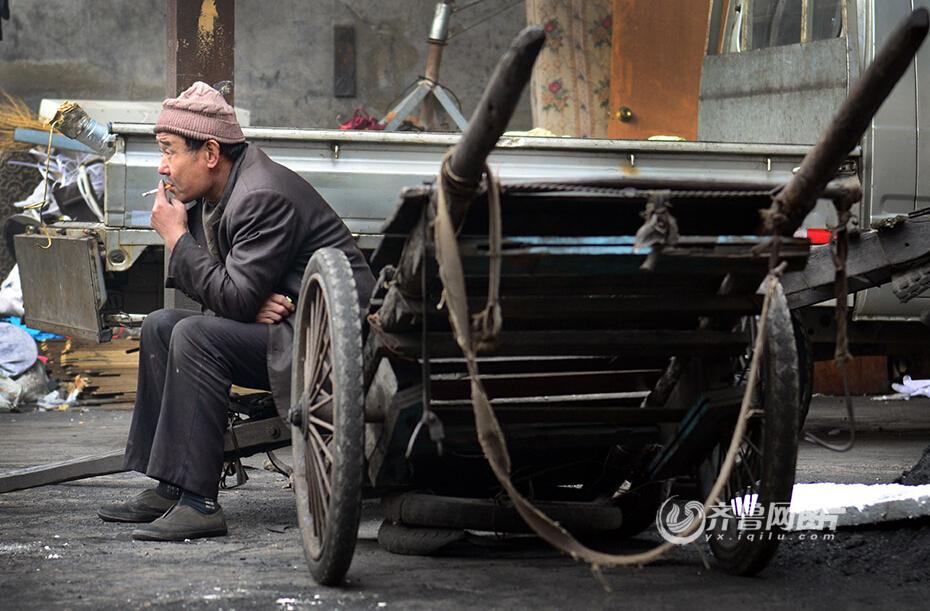 Lu usually sends honeycomb briquette door to door by handcart. Lu's work load is not that much as the recession comes. Lu smokes, sitting on the handcart. (Photo/Iqilu.com)