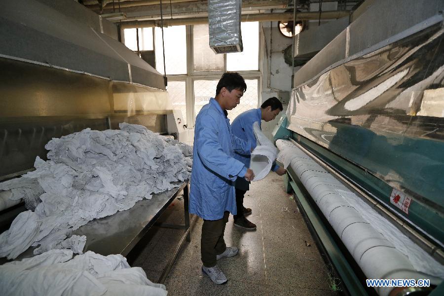 Workers scald train supplies at a cleaning center of the Beijing Railway Bureau in Beijing, capital of China, Feb. 2, 2015. A 40-day spring festival travel rush will soon begin, during which the Beijing Railway Station is expected to send 4.2 million passengers and receive 4.3 million passengers. The station has taken out measures to better serve passengers on their way.(Xinhua/Shen Bohan)