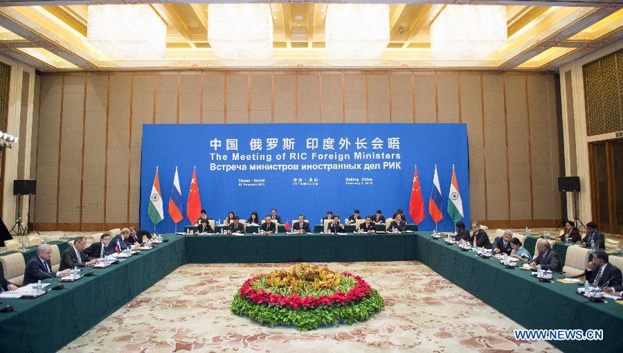 Chinese Foreign Minister Wang Yi, Russian Foreign Minister Sergey Lavrov and Indian Foreign Minister Sushma Swaraj attend the 13th Meeting of Russian, Indian and Chinese (RIC) Foreign Ministers in Beijing, capital of China, Feb. 2, 2015. (Xinhua/Xie Huanchi)