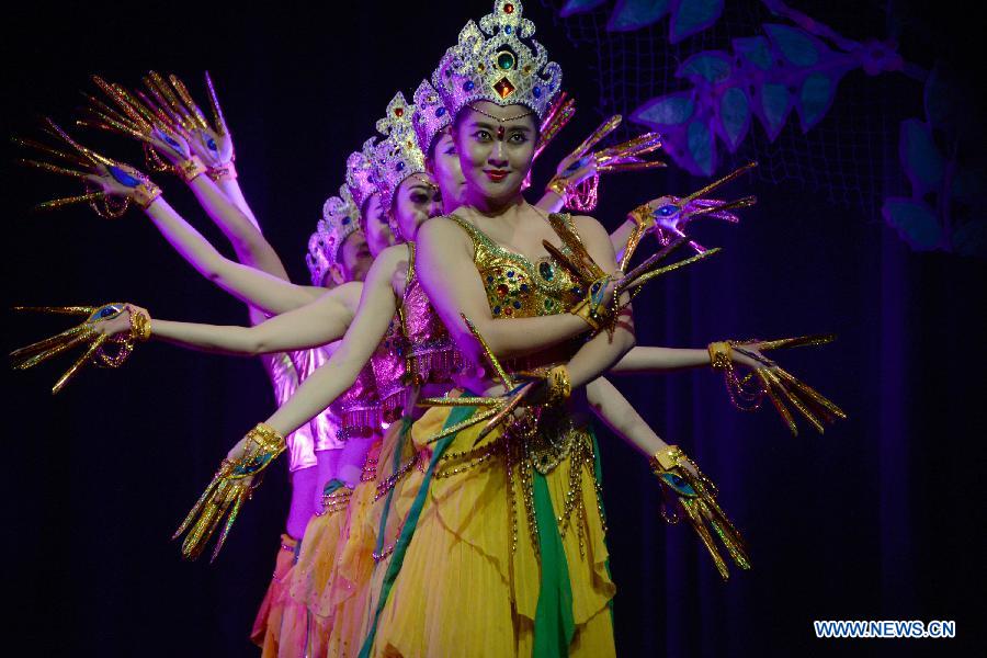 Chinese artists dance in a performance at the National Theater in Dhaka, Bangladesh, Feb. 3, 2015. A three-day Chinese cultural program started on Monday to mark the 40th anniversary of the establishment of the China-Bangladesh diplomatic relations. (Xinhua/Shariful Islam)