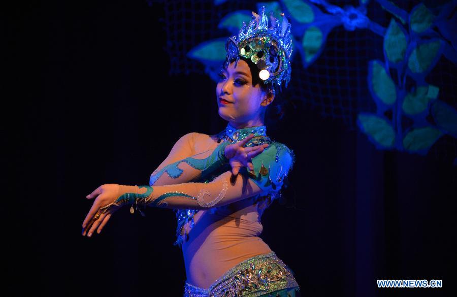 A Chinese artist dances in a performance at the National Theater in Dhaka, Bangladesh, Feb. 3, 2015. A three-day Chinese cultural program started on Monday to mark the 40th anniversary of the establishment of the China-Bangladesh diplomatic relations. (Xinhua/Shariful Islam)