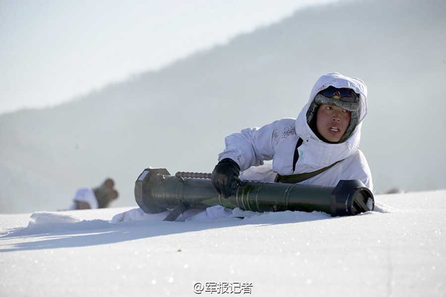 Photo shows a brigade under the Shenyang Military Region of the Chinese People's Liberation Army (PLA) conducting combat drills in the snowfield on Jan. 31, 2015. More than 10 units including infantry, artillery and communications jointly participated in the training, which tested the combat level of the troops under cold conditions. (81.cn/Photo)
