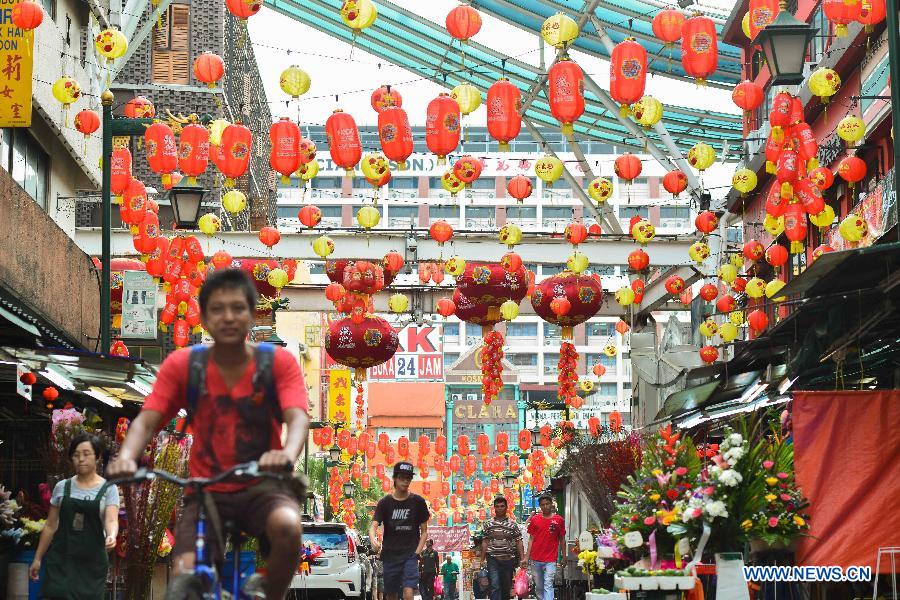 Pedestrians walk under red lanterns for the upcoming Chinese Spring festival in Kuala Lumpur, Malaysia, Feb. 4, 2015. (Xinhua/Chong Voon Chung)